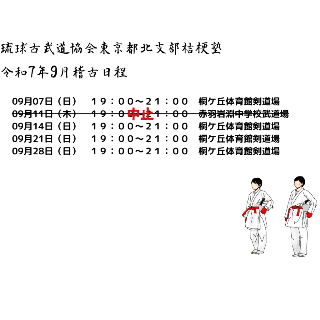 2025年9月8日 / 最終更新日時 : 2025年9月8日 ta711 稽古日程 令和7年9月稽古日程変更 9月11日(木)、稽古の予定が入っていましたが、体育館側の都合で利用できなくなりました。 当日、いらっしゃらないようお願いします。 twitter コメントを残す コメントをキャンセルメールアドレスが公開されることはありません。 ※ が付いている欄は必須項目ですコメント ※ 名前 ※ メール ※ サイト 次回のコメントで使用するためブラウザーに自分の名前、メールアドレス、サイトを保存する。 Δ